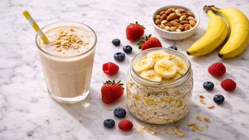 On days when you have absolutely no time to cook, a well-constructed smoothie is your best friend. Blend one ripe banana, one tablespoon of natural peanut butter, one cup of cold milk (dairy or plant-based), a teaspoon of honey, and a pinch of cinnamon. This takes approximately 90 seconds from start to finish and delivers an impressive nutritional profile — approximately 350 calories, 15 grams of protein, healthy fats from the peanut butter, and natural sugars and potassium from the banana.