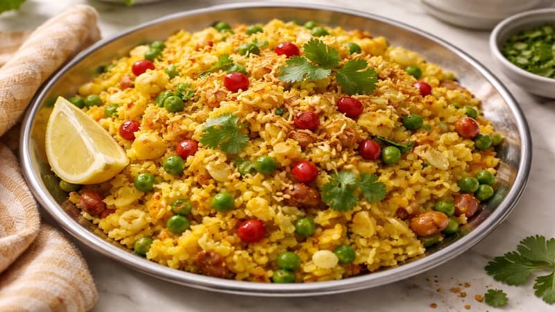 Add turmeric, drained poha, and salt. Toss gently and cook for 3-4 minutes. Finish with a squeeze of lemon juice, fresh coriander, and optionally some sev on top for crunch. Poha is a complex carbohydrate that provides sustained energy throughout the morning.