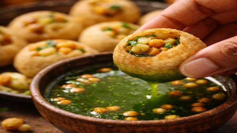 The pani is the soul of this dish — made from tamarind, mint, coriander, black salt, jeera, and green chilies, it is simultaneously tangy, spicy, minty, and refreshing. Each puri must be eaten whole in one bite for the full experience.